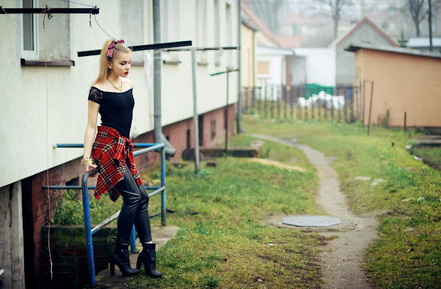 imprezę. Na nogach czarne, skórzane spodnie od Frontrowshop. Koniecznie