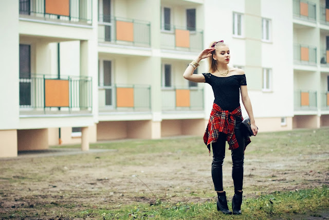 ramionami od Flaunt, nadająca całości trochę delikatności. Czarne botki, we