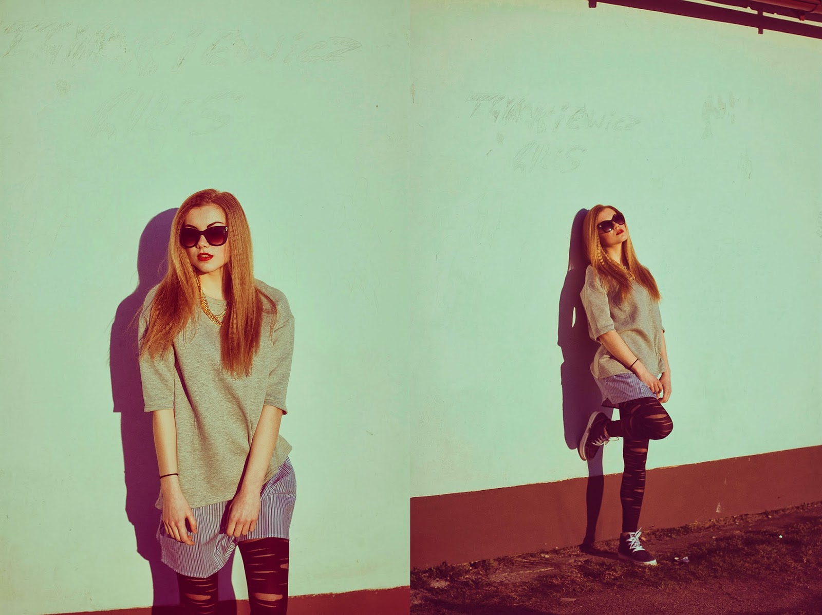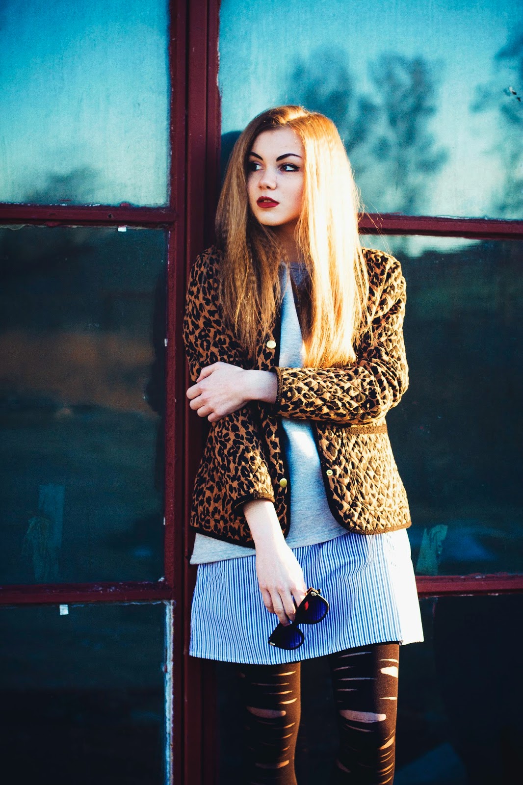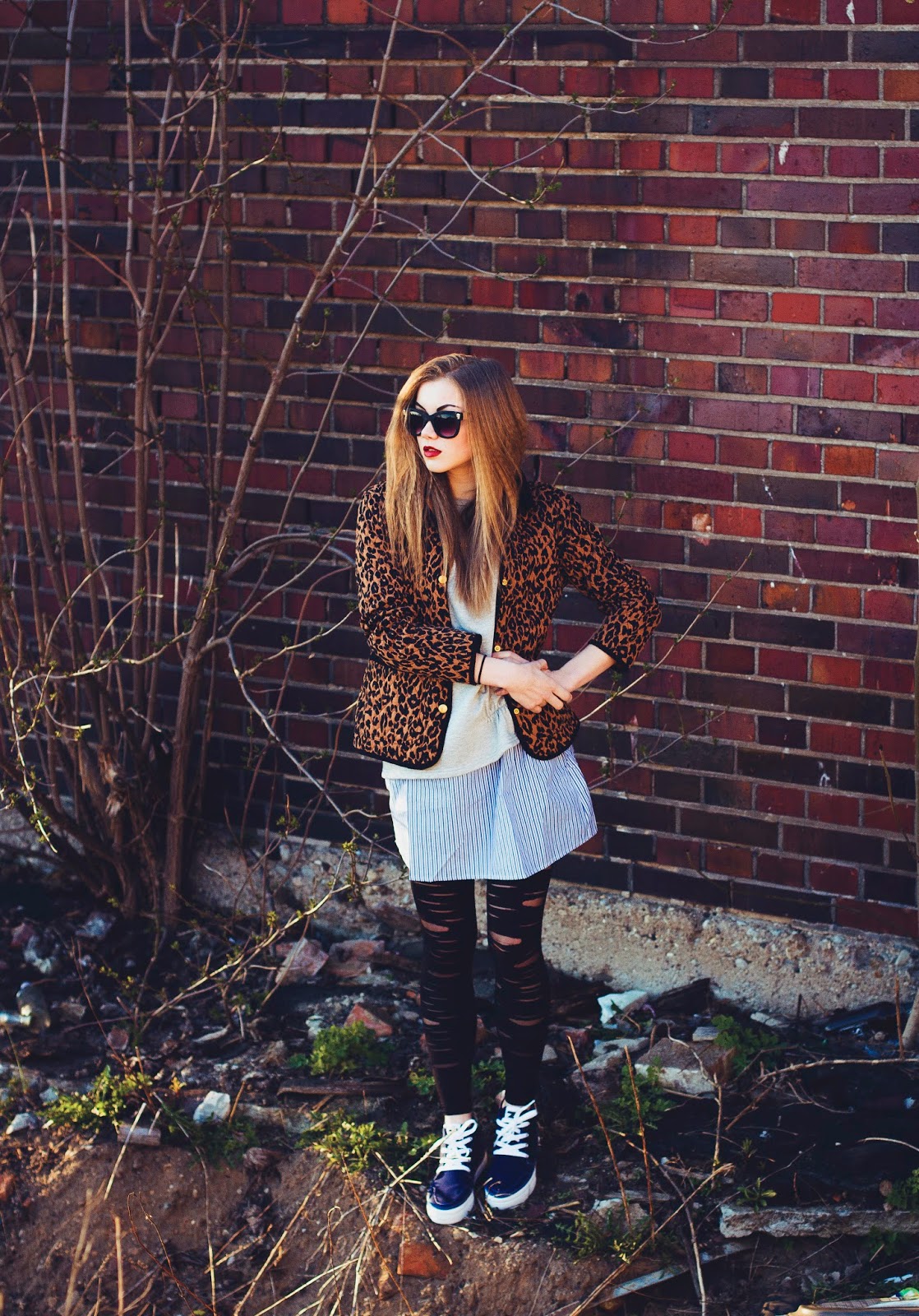Najpierw kilka słów do Was :) Dzisiejszy zestaw powstał bardzo spontanicznie, do ostatnich chwil przed zdjęciami nie miałam na niego konkretnego pomysłu. Efekt jednak, jak dla mnie, bardzo zadowalający :) Głównym elementem jest tutaj rewelacyjna sukienka od FrontRowShop. Składa się ona z dwóch elementów, bluzy i wystającej spod niej koszuli. Idealnie wpasowała się w mój gust. Dobrałam do niej czarne getry, złoty naszyjnik i kurtkę w panterę.